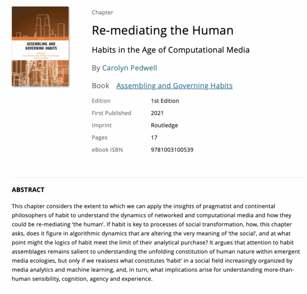 Pedwell C. (2021) ‘Re-mediating the Human: Habits in the Age of Computational Media’ in Assembling and Governing Habits. Eds. T. Bennett, B. Dibley, G. Hawkins and G. Noble. London: Routledge.